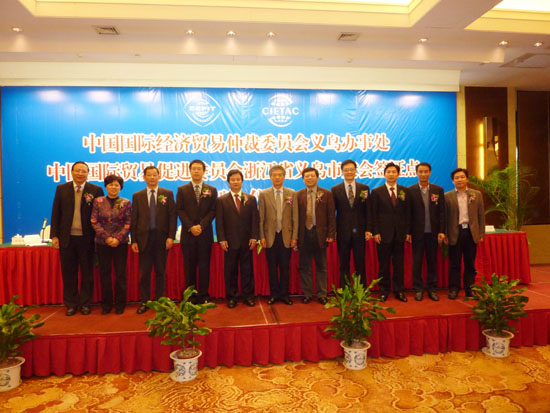 2010年11月9日下午,中国国际经济贸易仲裁委员会(简称贸仲)义乌办事处授牌仪式在浙江省义乌市锦都酒店举行。中国贸促会副会长董松根出席揭牌仪式,并与义乌市市委书记黄志平同志共同为贸仲义乌办事处揭牌。贸仲副秘书长杨春雷出席仪式并致辞。义乌市市长何美华致欢迎辞,市领导童香娣、杨林章、季金甫等出席仪式。贸促会浙江省分会有关领导,义乌市贸促会42家委员单位代表,市国际商会31位副会长、理事及部分会员企业代表160余人参加了仪式。
